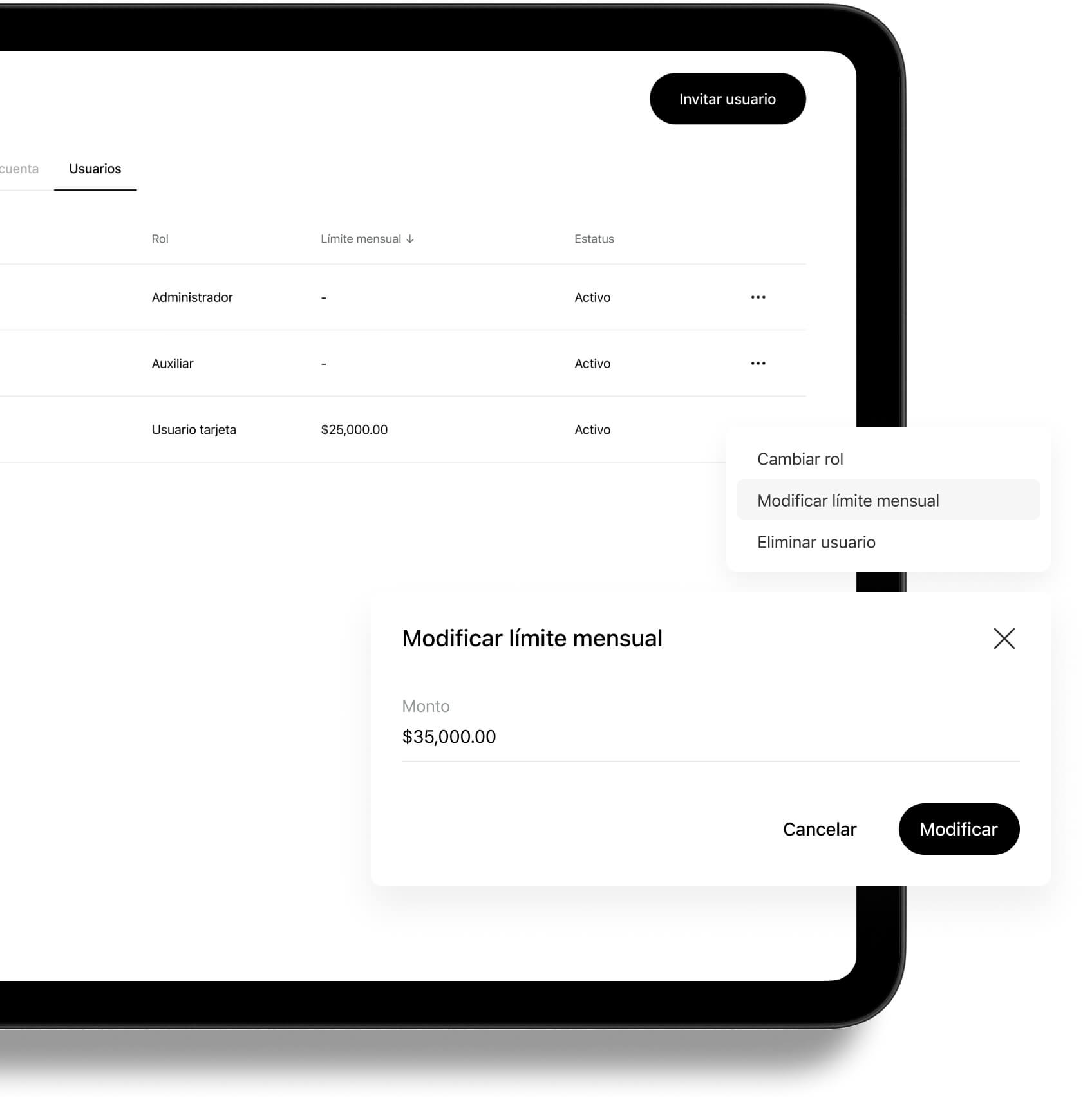 Crea usuarios según el rol y permisos que necesites, ya sea administrativo, solo de consulta o para usar tarjetas con un presupuesto asignado.
