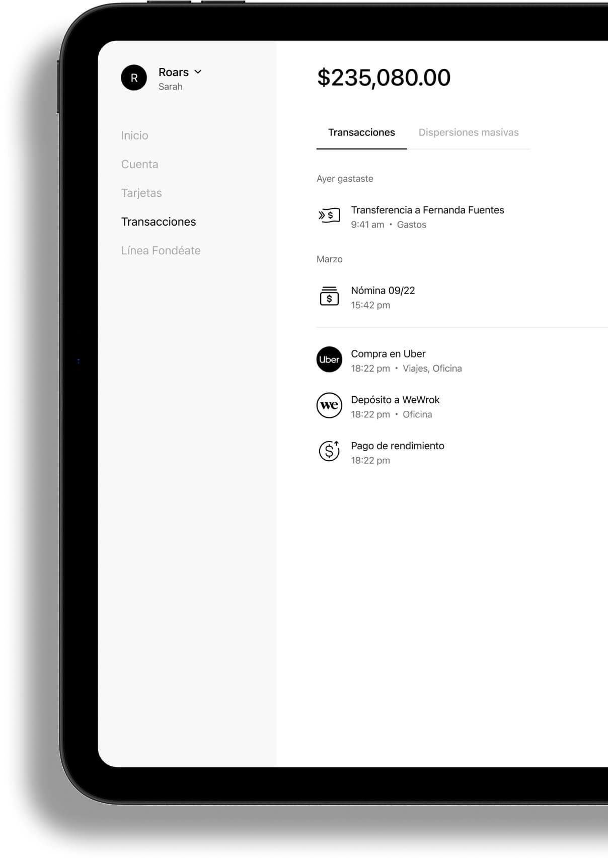 Visualiza el saldo disponible, consulta movimientos, etiqueta gastos y exporta el detalle de tus transacciones en segundos.